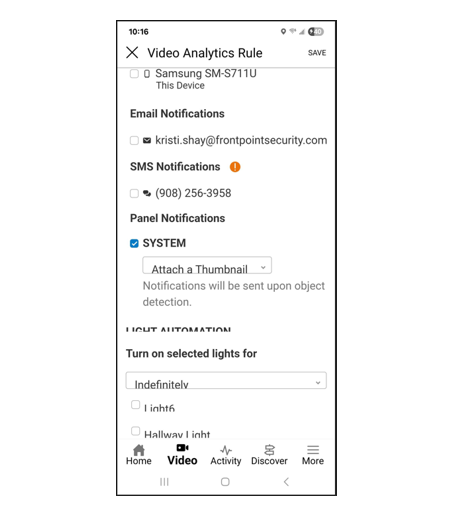Enable your cameras to stream to your panel and watch live video from all of your Frontpoint cameras to check in with what's happening at home and around your property. Use Two-Way Audio on compatible cameras to hear and speak with visitors with the walkie-talkie like, press-to-talk control system. Enable doorbell call notifications to be sent to the Display Hub+, so when the button is pushed on your Frontpoint Wired or Wireless Doorbell Camera you'll be informed someone is at your door.